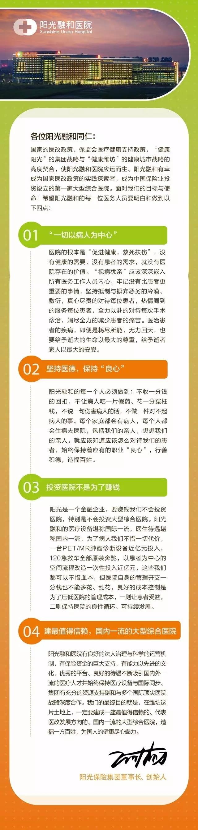 5月8日,在阳光融和医院正式开诊之际,张维功董事长亲笔写下了一篇语重心长的寄语,郑重声明了阳光保险进入医疗产业的价值主张,向全体医务人员提出明确的职业“良心”及把阳光融和建设成一座最值得信赖的、代表医改发展方向的、国内一流的大型综合医院的目标方向。