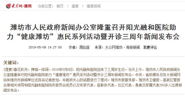 大众网 :潍坊市人民政府新闻办公室隆重召开阳光融和医院助力“健康潍坊”惠民系列活动暨开诊三周年新闻发布会