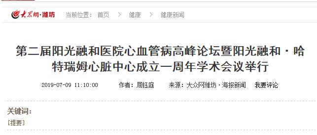 大众网:第二届阳光融和医院心血管病高峰论坛暨阳光融和·哈特瑞姆心脏中心成立一周年学术会议举行