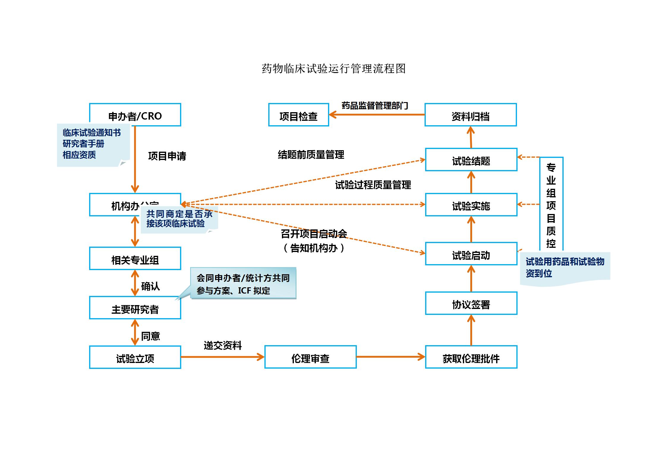 二、立项审查:申办者提供“临床试验通知书、试验方案初稿和研究者手册”等资料;专业组研究者填写《药物临床试验项目立项申请表》;研究者根据“药物临床试验项目资料递交清单”,与申办者共同准备资料并递交机构办公室;机构办公室秘书负责资料受理及文件的形式审核、机构办主任审核、机构主任批准,给予回执;机构办公室对临床试验项目进行立项。