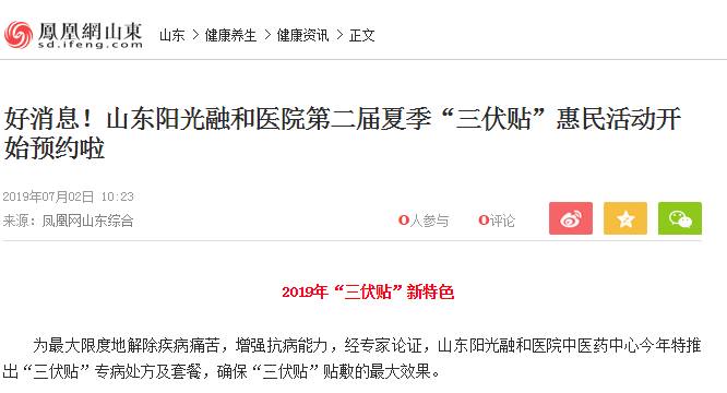 凤凰网:好消息!山东阳光融和医院第二届夏季“三伏贴”惠民活动开始预约啦